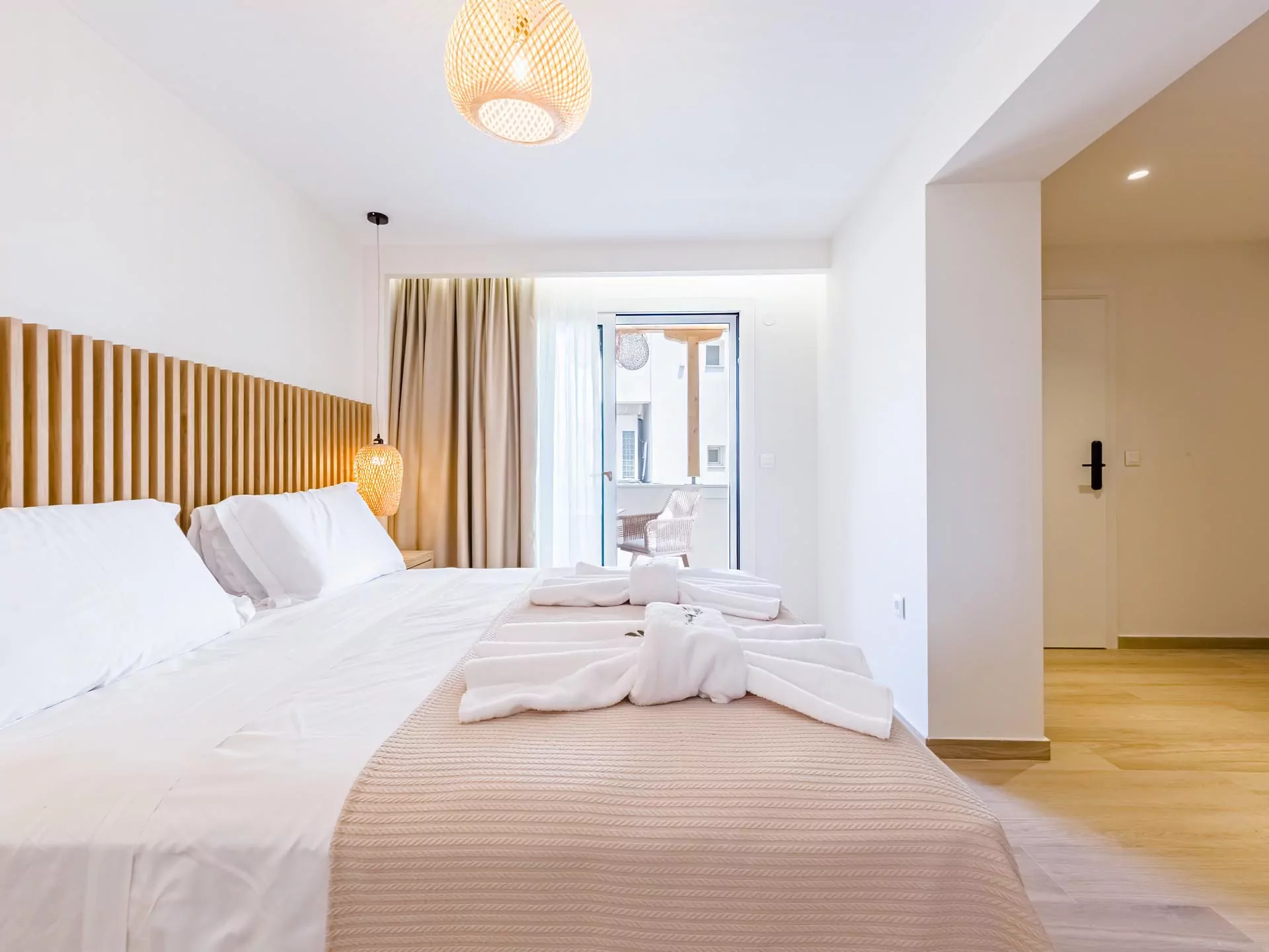 studio opens to a private terrace with a serene garden view, offering a peaceful retreat.