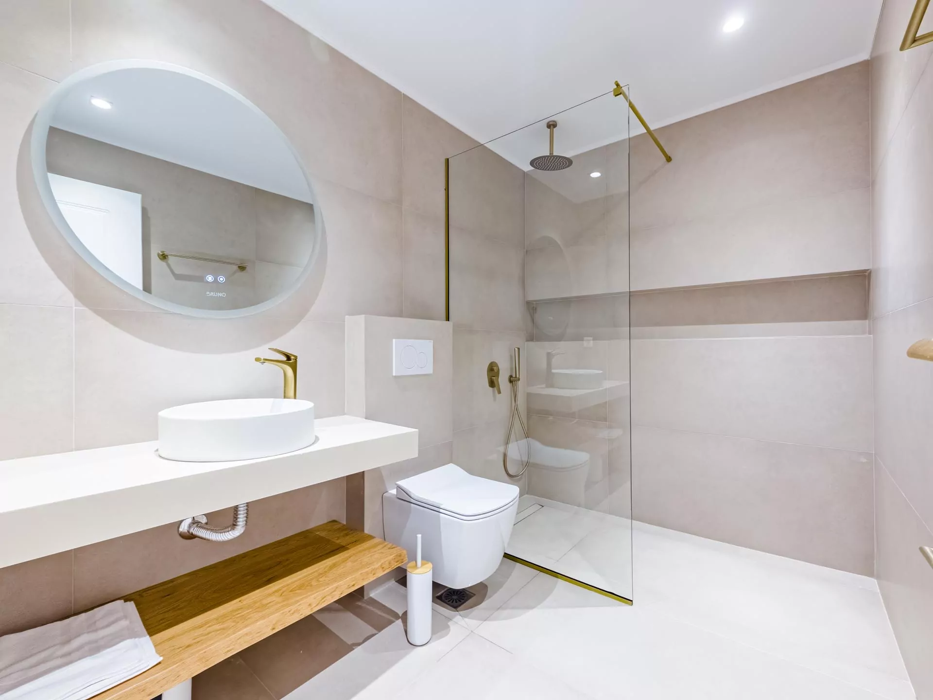 The bathroom is equipped with a luxurious rainfall shower and a smart mirror, adding a touch of modern